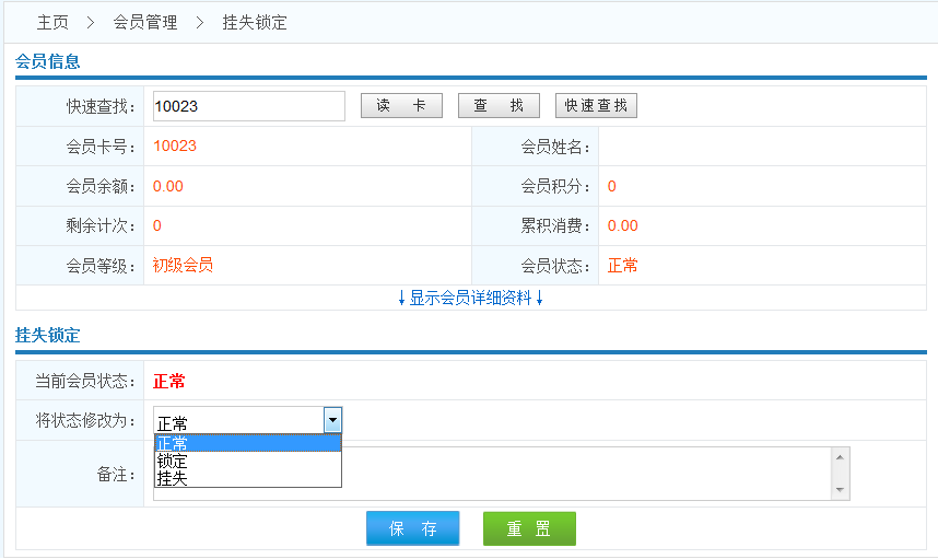注意:修改會員的不同狀態(tài)信息,控制會員卡的使用范圍 掛失/鎖定的卡,在系統(tǒng)中將不可操作,要想重新啟用該會員卡,必須將會員卡的狀態(tài)信息改為正常!