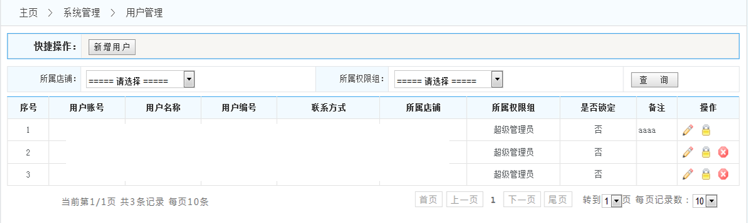 2.查詢(xún):可以所屬店鋪和所屬權(quán)限組查找出符合條件的系統(tǒng)用戶(hù)