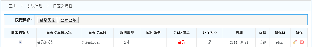 自定義屬性設(shè)置:清除全部數(shù)據(jù)、還原測(cè)試:給會(huì)員新增自定義屬性字段,可在會(huì)員列表體現(xiàn).點(diǎn)擊【顯示全部】自定義字段全部顯示在會(huì)員列表中