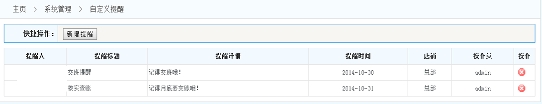 2.提醒列表:在提醒列表的操作一欄 可以對自定義的提醒進行刪除操作