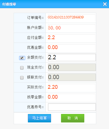 點(diǎn)擊結(jié)算圖標(biāo),將彈出付費(fèi)找零對話框,點(diǎn)擊馬上結(jié)算可完成此掛單消費(fèi):