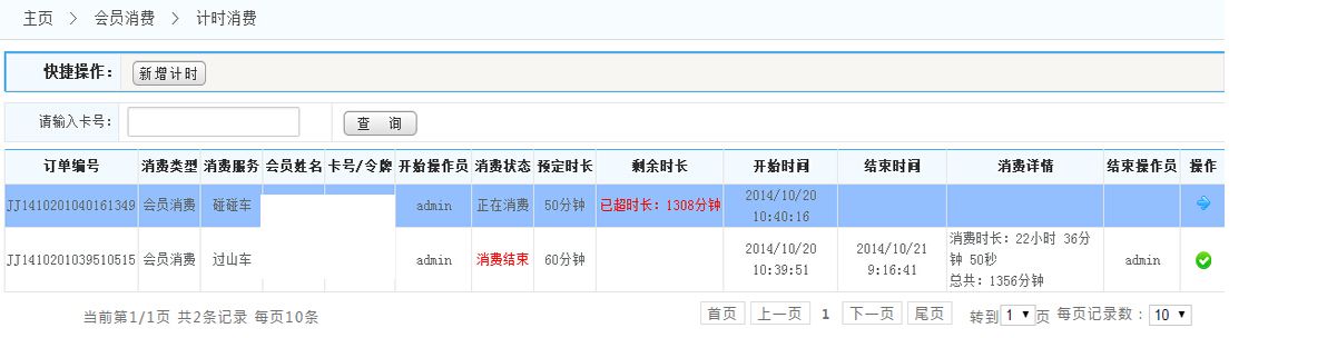 顯示:點擊菜單欄的計時消費,將進入如下界面, 此頁面顯示的是計時消費的詳細列表